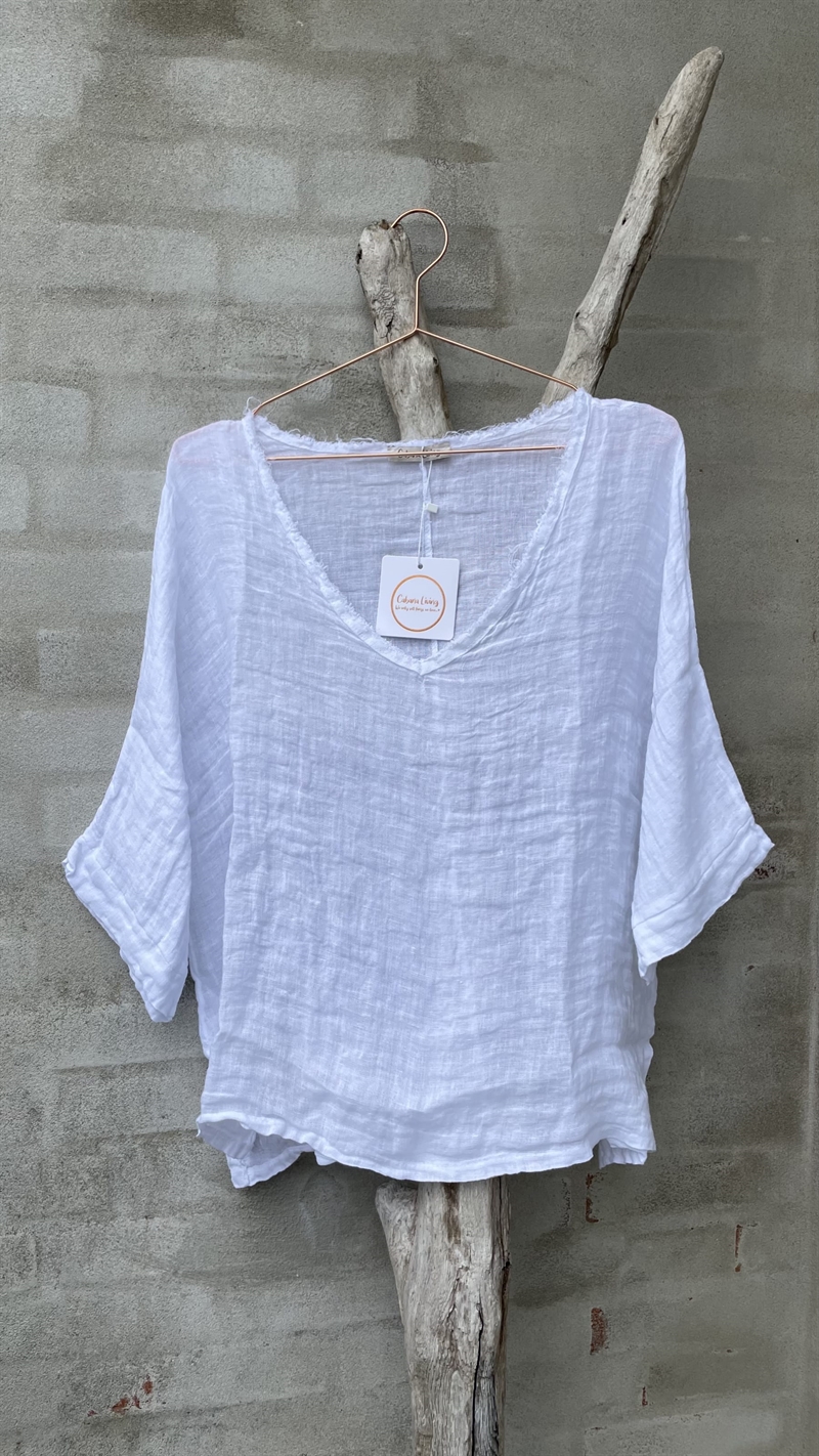 PRODUKTINFORMATION: Cabana Living 2328 White - Hørskjorte Hørskjorte fra Cabana Living med V-hals og rå kanter Mangler din størrelse så skriv endelig til info@newseason.dk, så vil vi undersøge om den kan skaffes hjem. Produkt nummer: 2328 White Materiale: 100 % hør Pasform: Brystmål: S/M: 120, M/L 124 cm Farve: White