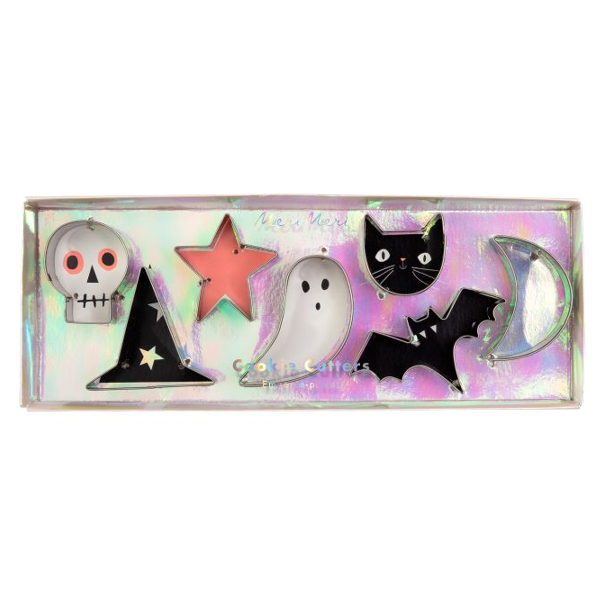 Bag uhyggeligt lækre halloweensmåkager med kageudstikkerene fra Meri Meri. Pakken indeholder 7 små kageudstikkere formet som kranie, heksehat, stjerne, spøgelse, kat, flagermus og måne. Et perfekt sæt når der skal bages lækkerier til halloweenaften. Prøv at dekorere kagerne med glasur og lad dig inspirere af Meri Meris design. Kageudstikkerne er fra Meri Meri, der er stor producent af gennemførte fest- og fødselsdagstemaer. Du kan få alt fra servietter, krus og paptallerkner til lys, balloner og kageudstikkere. Meri Meri har alle de produkter, der skal bruges for at dække et flot og festligt bord. Materiale: rustfrit stål Pakken måler 20,3 x 7,6x 2,5 cm Fra 3 år Se alle varer fra Meri Meri