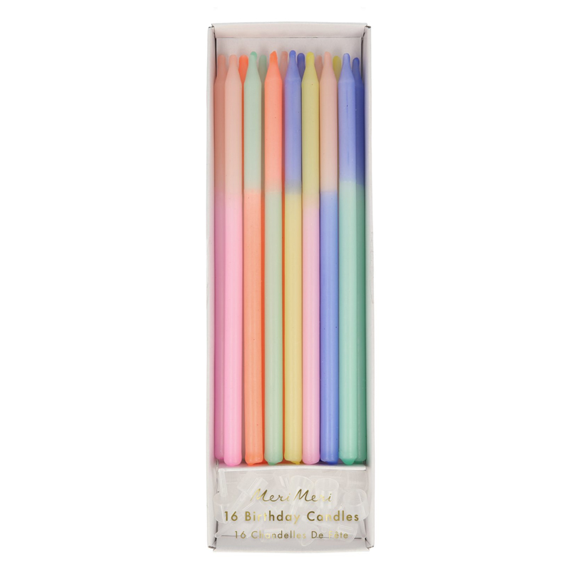 Dekorér fødselsdagskagen med disse fine lange lys fra Meri Meri. Lysene har forskellige flotte pastel farver i to nuancer. Der medfølger små plastikholdere, så lysene nemt kan sættes ned i kagen. Lysene er fra Meri Meri, der er stor producent af gennemførte fest- og fødselsdagstemaer, hvor du kan få alt fra servietter, krus og paptallerkner til lys, balloner og kage udstikkere. Meri Meri har alle de produkter, der skal bruges for at dække et flot festbord. Pakken indeholder 16 lys, inkl. holdere Lysene måler 14,6 cm. Se alle varer fra Meri Meri