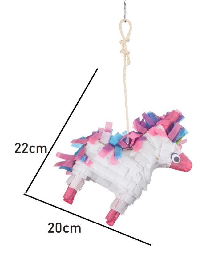 Fouragering til aktivering af din fugl Pinata er altid sjovt og hyggeligt for papegøjer. Materialet er meget let at splitte ad, og det er papegøjer glade for. Dette papegøje legetøj er beregnet til at gemme godbidder indeni - som papegøjen eller parakitten således skal gnave sig ind i. Selv mindre parakitter ville kunne sætte næbbet i dette sjove legetøj, især hvis/når den opdager f.eks en hirsekolbe indeni, fordi materialet netop er porøst nok til at selv mindre næb kan gennemtrænge det.