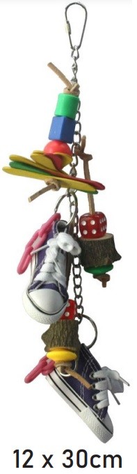 Vær OBS på din fugls legeadfærd, og på alle smådele. Ophæng er ikke stærkt og de runde ringe er ikke svejst. Klip snørrestopperen af snørrebåndene.