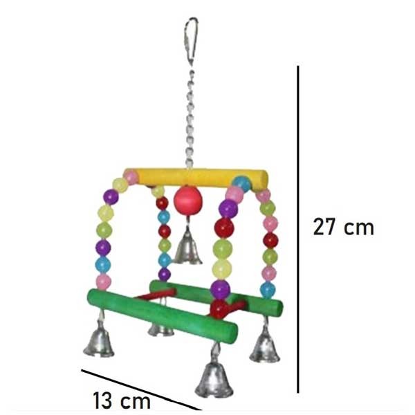 Fuglelegetøj - fuglegynge Denne fugle gynge er et hit for små og større parakitter. De tiltrækkes af farverne og bevægeligheden når den hænger frit og højt i buret. En romantisk gynge også, hvis man er to. NB - Vær altid meget opmærksom på palen inde i klokker - den kan uden opsyn udgøre en risiko. Fjern den evt, hvis fuglen/fuglene leger uden opsyn.