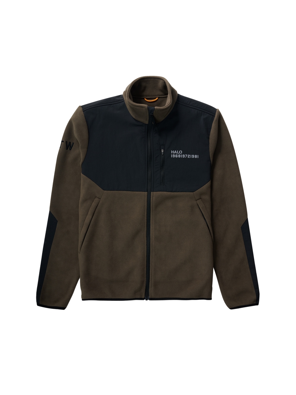 Fleece i kontrast farver fra HALO. Jakken er i blød fleece med høj hals og den lukkes med lynlås. Jakken har to skrå lommer i siderne samt en brystlomme - alle med lynlås. Den har logo på brystet.