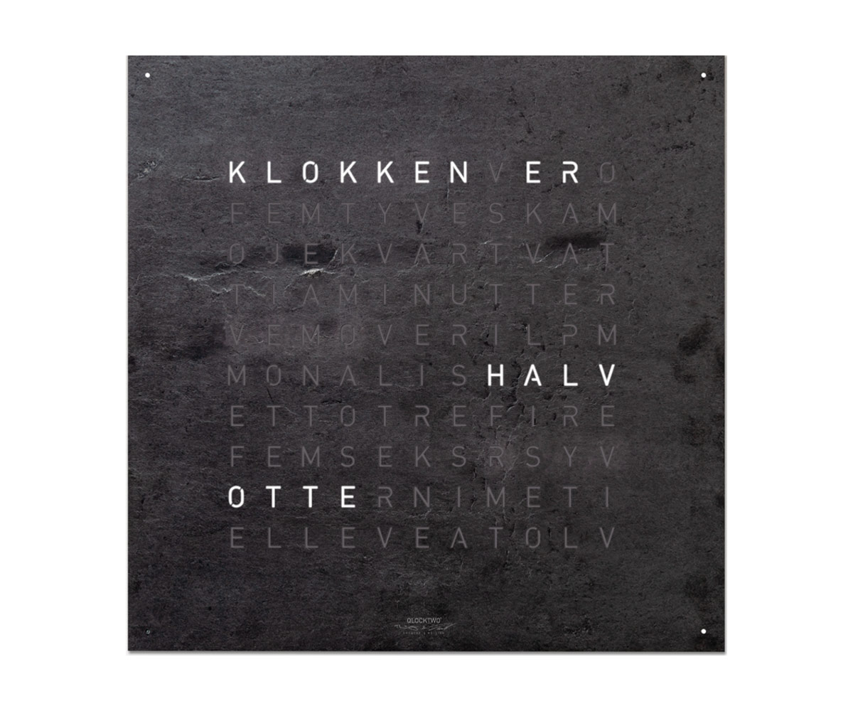 Design: Biegert & Funk Beskrivelse: QlockTwo Classic får dig til at stoppe op og se tiden på en helt anden måde. Det typografiske display kombinerer øjeblikket med det skrevne ord og gør tiden til en erklæring f.eks. "Klokken er kvarter i tolv". For den gadget elskende er QlockTwo er et absolut "must have". Denne version er en Creators Edition i eksklusive materialer. Uret måler 45×45×2 cm. med korpus i hvidlakeret træ og frontcover i forskellige varianter. OBS: Uret leveres som standard med dansk tekst - ønskes andet sprog, noter venligst dette i bemærkninger til din bestilling. Kvarts ur, med let manuel tidsindstilling Automatisk justering af lysstyrke Vægbeslag samt bordstander er incl. Automatisk justering af tid via radiosignal. Lavt energiforbrug på grund af LED-teknologi Håndlavet i Tyskland Vægt ca.. 4 kg. Materiale: Hvidlakeret træ Skifer - Mærker > QlockTwo - QlockTwo