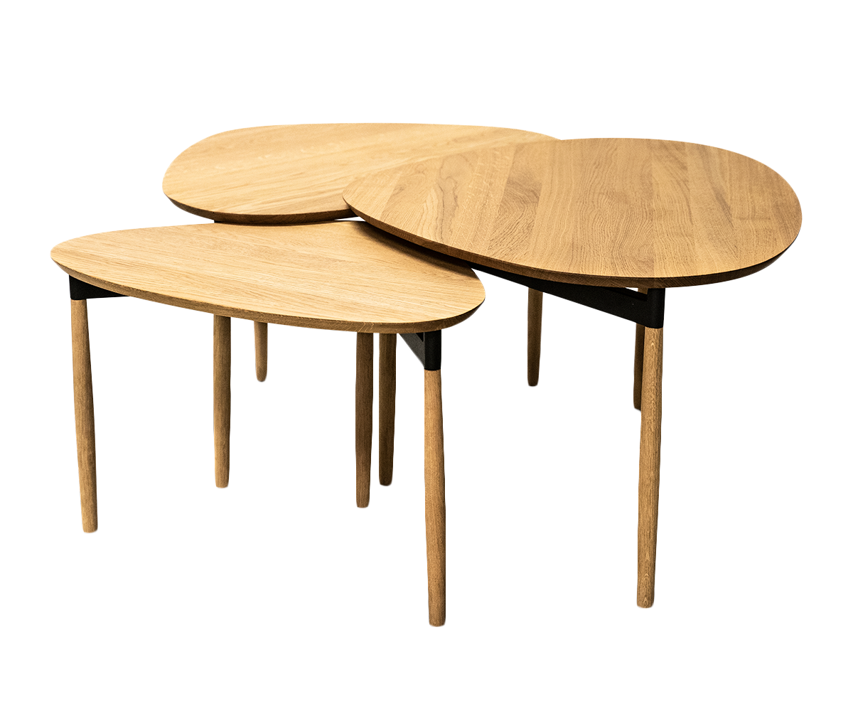 Design: Pilgaard Design Studio & Designbydane Beskrivelse: Indskudsbordene Forma har en overraskende praktisk feature. Sættet med de tre sofa/sideborde glider ubesværet ind under hinanden og låser, så du nemt kan løfte alle tre borde på én gang ved blot at holde i det øverste bord. De muslingeformede borde kan tilsammen danne et utal af forskellige former, der giver rum til kreativitet. Spred Forma bordene ud i en form, der passer til netop din indretning. Udtryksmulighederne er uanede. Indskudsbordene er pladsbesparende, og den lette konstruktion gør bordene nemme at flytte rundt, så du altid har et sted at sætte kaffekoppen. Materiale: Eg, olieret Stål, pulverlakeret - Borde - Bent Hansen