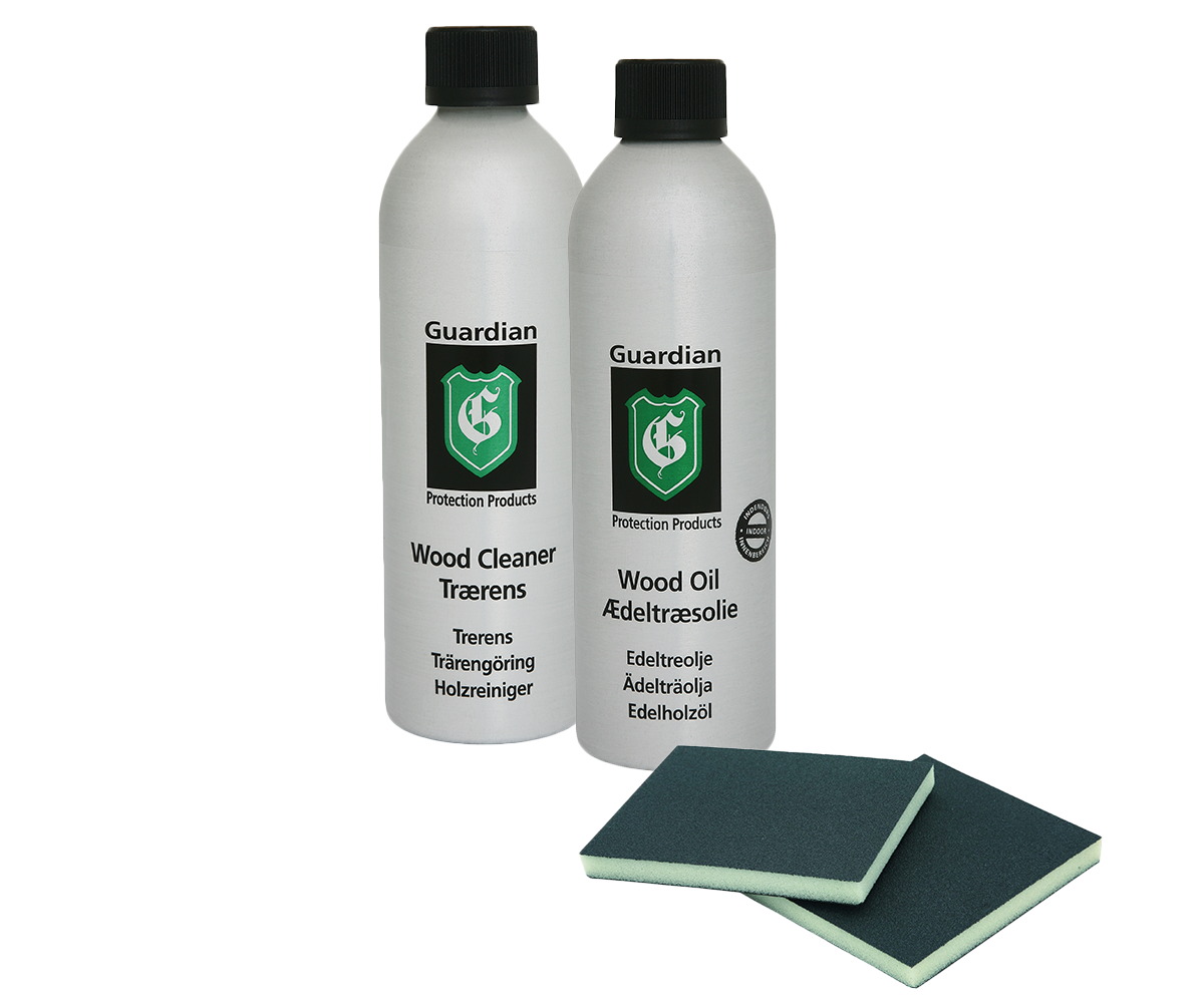 Producent: Guardian Beskrivelse: Guardian Natur træplejesæt indeholder alt hvad der skal bruges til vedligeholdelse af natur træ. Guardian Trærens er specielt udviklet til effektiv rengøring og affedtning af ikke-lakerede indendørs træoverflader. Produktet er baseret på naturlige sæber – et universalrengøringsmiddel til træ. Guardian Ædeltræsolie anvendes til vedligeholdelse af ubehandlede eller olierede møbler i hårde træsorter som bøg, ask, eg, teak, merbau og lignende. Den terpentinfrie olie er baseret på de fineste og reneste olier, virker vandafvisende og beskytter træet mod udtørring. Der medfølger desuden 2 stk. slibesvampe. Testet af Teknologisk Institut og tildelt Indeklimamærket. Indhold: Guardian trærens Guardian ædeltræsolie 2 stk. slibesvampe - Mærker > Guardian - Guardian
