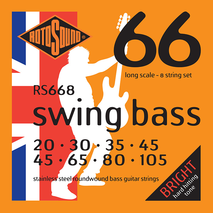 SWING BASS 66 (Stainless Steel or Nickel Roundwound) The most popular Roundwound bass string ever. Rotosound was the first string company to produce this kind of string. Introduced in 1962 it changed the sound of the instrument instantly. The favourite string of many players including Billy Sheehan, John Paul Jones and Geddy Lee. Available in all popular gauges and scale lengths. The stainless steel used to produce these strings is unique and nickel free, coupled with a highly secretive manufacturing process. 8 String Sets RS668 20 - 30 - 35 - 45 45 - 65 - 80 - 105