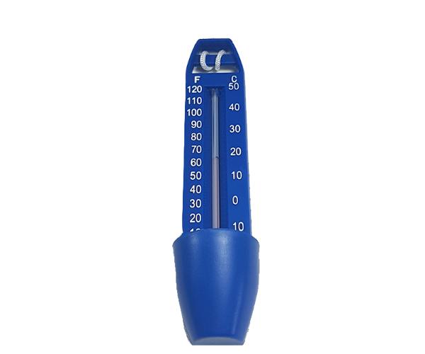 Termometer til swimmingpools. Termometret kan både flyde i badevandet eller hænges fast på stigen.