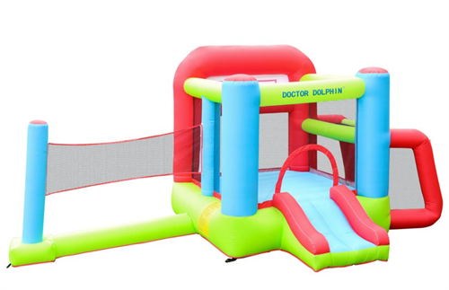 Denne Doctor Dolphin hoppeborg byder på både hoppeområde, rutsjebane og et sejt basketballnet, hvor børnene kan skyde til måls og dyste mod hinanden.