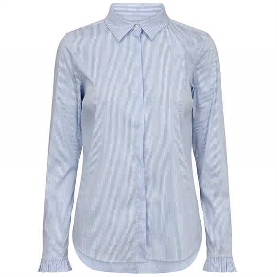 Tilføj et klassisk og feminint touch til din garderobe med den elegante Mattie Flip Stripe Shirt fra Mos Mosh. Skjorten er fremstillet i en blød og lækker kvalitet, der sikrer en behagelig pasform hele dagen. Det slanke, figursyede snit fremhæver silhuetten på smukkeste vis, mens de fine detaljer som den skjulte knaplukning, klassiske krave og feminine flæsekant ved ærmerne giver et eksklusivt udtryk.