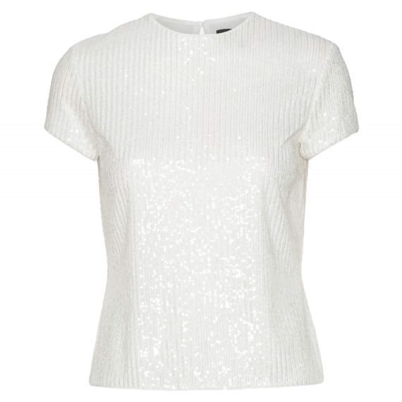 Smuk og festlig T-shirt med kort ærme og rund halsudskæring. Toppen har en tætsiddende pasform og er dækket af lodrette pailletter, der giver et elegant og glitrende udtryk. Den har en lille nøglehulsåbning med knaplukning bagpå og er foret for en behagelig pasform. Perfekt til festlige anledninger eller som et iøjnefaldende statement-piece.