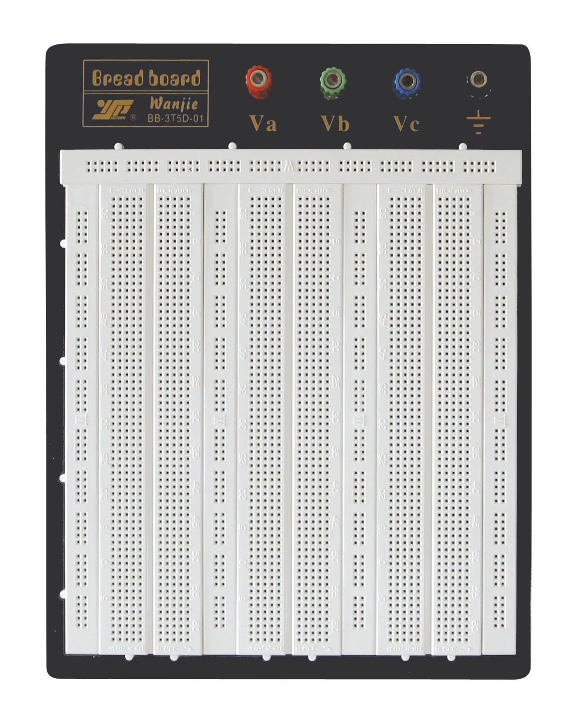 "Fumlebræt" Eksperimental-plade med 1920 kontakter + 5 rækker med fordelerkontakter á 100 stk. - ialt 2420 kontakter.Breadboardet er monteret på en aluminiumsplade med gummifødder og 4 stk. 4mm. bananbøsninger.Mål: 235x185mm.