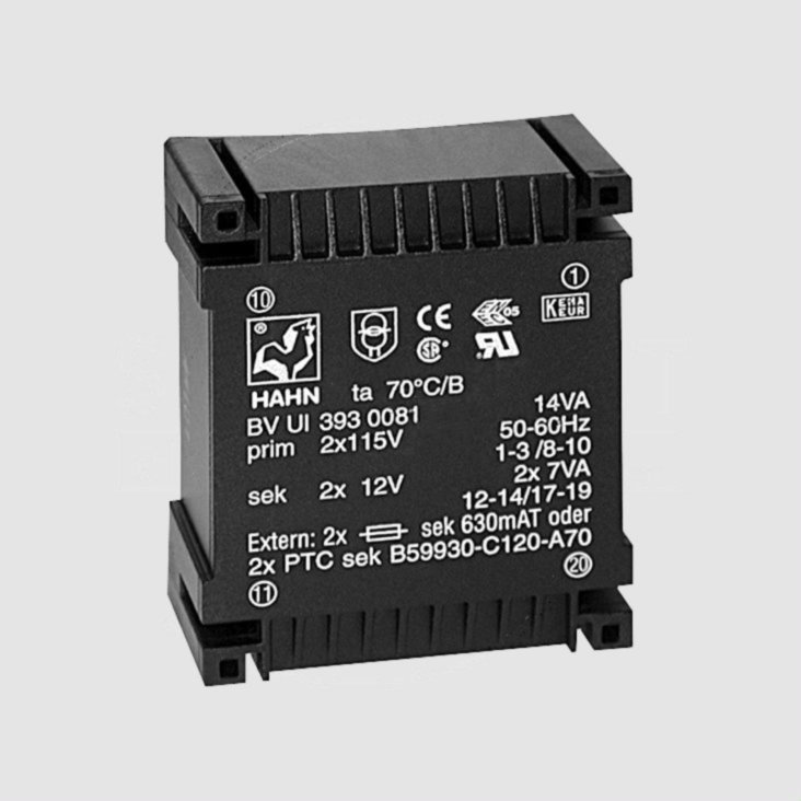 Construction• Vacuum encapsulated, bobbin with two chambers• Leads through soldering pins to accommodate PCB mounting • Designed to match VDE 0570 regulations• Fully tested at primary and secondary voltage of 6000V, leakage and sparking distance in air is at least 10mm• Types with double primary and secondary windings (2x115V) suitable for application in 115V as well as 230V power suppliesElectrical SpecificationsPart Nr.P1)SecondarySecondaryNo-LoadVoltageCurrent2)Voltage[VA][V][mA][V]BVUI3930085142x62x11668,3BVUI3930074142x92x77812,4BVUI3930081142x122x58316,5BVUI3930062142x182x38924,7BVUI3930096142x212x33428,8BVUI3940086182x62x15008,7BVUI3940073182x7,52x120010,2BVUI3940063182x92x100013,0BVUI3940087182x122x75016,7BVUI3940088182x152x60020,4BVUI3940075182x182x50023,6BVUI3940097182x212x42824,7BVUI3950098242x92x133311,4BVUI3950091242x122x100014,9BVUI3950083242x152x80018,5BVUI3960102302x92x166611,3BVUI3960079302x122x125015,0BVUI3960103302x152x100018,6P = Power, 1) Primary Voltage at 230V, 2) Secondary Voltage per Winding 5%SizePerformanceHeight hWeight[mm][g]14VA25,233018VA28,539024VA32,046030VA36,0550Approvals 05Terms of DeliveryMinimum order quantity: 1 PKU = 1 pieceArticles in bold print in stock, other articles of 100 pieces upwards available on request, delivery time approx. 5 weeks.ManufacturerHAHN GmbH & Co. KG http://www.hahn-trafo.com