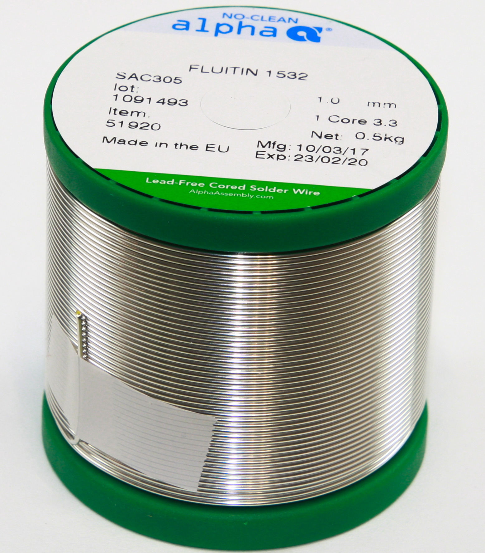 Gruppe: R5132ALPHA-COOKSON Lead-free Soldering Wires Halide-activated Flux 3,3% Diameter: 0,5, 0,75 and 1,0mm Series: Fluitin 1532 SAC305Features• Rosin acitvated soldering wire for all hand soldering• Excellent soldering properties even on difficult solder components and surfaces • High spread speed• Non-corrosive, clear, safe residue• Excellent wetting speed• Excellent joint cosmetics• Non-corrosive, in accordance with DIN 8516Technical Specifications Alloy (Lead-free):Sn96,5Ag3Cu0,5Melting Point:217°CDensity:7,37g/cm³Flux Content (F-SW26)EN29454-1:1.1.2J-STD004:ROM1Content:3,3 Weight -%Flux Content:Single CoreNoteYou will find soldering stations and irons starting at product group T1121.Terms of DeliveryMinimum order quantity: 1 PKU = 1 pieceManufacturerhttp://www.alpha.cooksonelectronics.com
