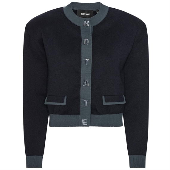 Denne fine cropped cardigan fra ROTATE, er strikket i en eksklusiv blanding af økologisk bomuld og kashmir. Det faste, men bløde materiale giver en smuk, struktureret pasform, der både føles og ser raffineret ud. Designet skiller sig ud med en tofarvet ribkant ved halsudskæringen og knapstolpen, som tilføjer et grafisk twist. Fortil prydes cardiganen af metalbogstaver, der staver “ROTATE” – en iøjnefaldende detalje, der tilfører kant og karakter.
