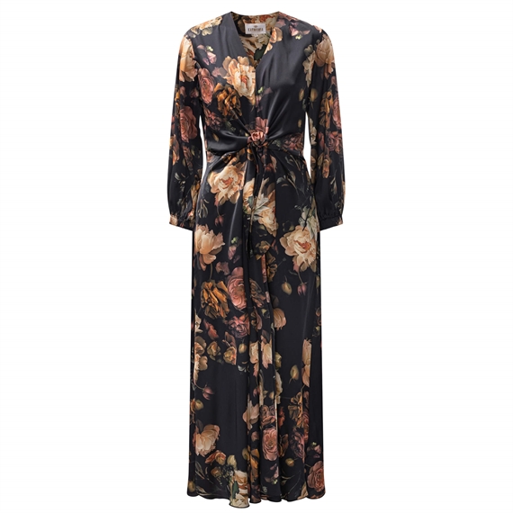 Faye Dress fra Karmamia er en smuk maxikjole med V-udskæring og bindebånd i taljen. Den smukke kjole har den skønneste pasform og flot blomsterprint langs bunden.
