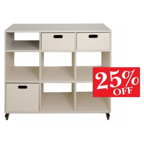 Mobil Reol med 9 rum uden skuffer. (ØNSKER DU AT PRINTE SIDEN? SÅ GÅ NEDERST PÅ SIDEN OG TRYK PÅ PRINTER) 18 mm hvidpigmenteret birkekrydsfiner med lysegrå laminat på toppladenGod kvalitetDette produkt er fremstillet under FSC- certificering. Miljømærket for ansvarlig skovbrug!der kan tilkøbe skuffer og opbevarings kasser. ed at klikke her:stor opbevarings kasse 2500550 : linklille opbevarings kasse 2101510 : linkLeveres som standart med hjulEkskl opbevaringskasserMål: H 894 mm B 1227 mm D 450 mm Dette produkt tillægges fragt ved "kassen"Ran-Play varenr: 210151013*2101