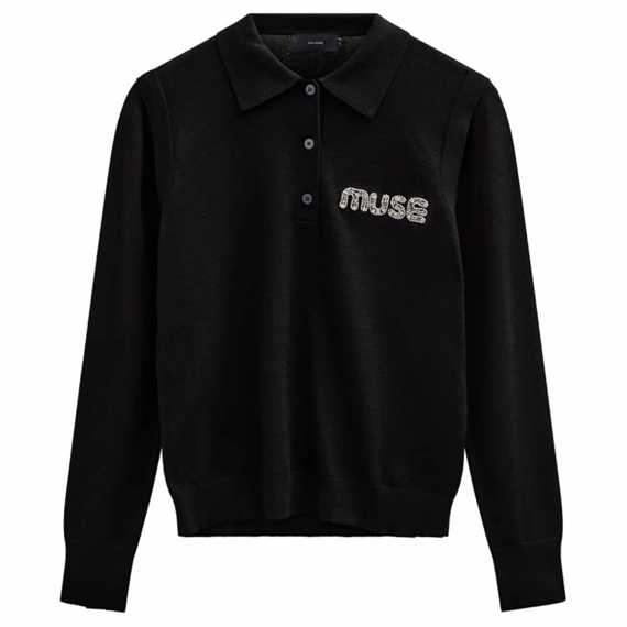 Opgrader garderoben med denne sorte polo fra Copenhagen Muse. Blusen har en klassisk polokrave med tre knapper, lange ærmer og en tidløs pasform, der gør den nem at style til både hverdag og arbejde. På brystet er den dekoreret med det iøjnefaldende muse-logo, som giver et moderne og eksklusivt udtryk.