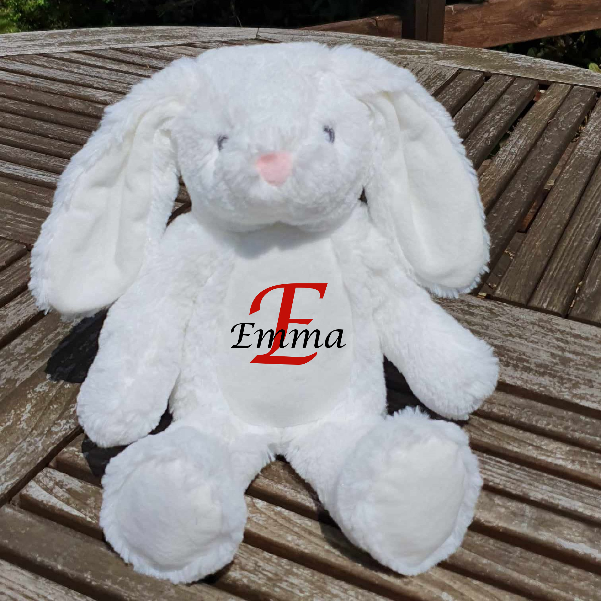Vores skønne hvide kanin-bamse er den ultimative gave til barsel, dåb, babyshower eller fødselsdag. Den bløde og kærlige bamse vil blive din babys eller dit barns bedste ven at putte sammen med eller søge trøst hos. Med et personligt præg bliver den endnu mere unik. Gør de små glade med deres helt egen bamse, hvor navnet er håndtrykt. Vores bamser er utroligt populære hos børnene og vil uden tvivl skabe glæde og tryghed i mange år fremover. Bamsen måler ca. 30 cm Navnepåsætning: Tryk Materiale: 100% polyester Håndvaskes Anbefales fra 0+. CE-mærket, EN071 OBS: Vi sætter barnets fornavn på, helt uden ekstra beregning.