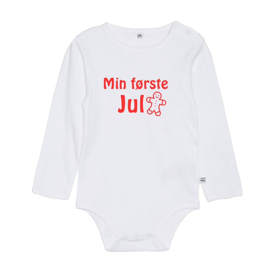 Blød body med lange ærmer - str. 62-68-74-80 Hvid bodystocking "Min første Jul" med print rød farve Bodyen har sidesømme, amerikansk lukning i halsen / eller to trykknapper over venster skulder og trykknapper forneden Materiale: Oeko-tex Standard 100 i 100% bomuld Tåler finvask ved 40 grader Tåler ikke tørretumbling. Tåler ikke strygning Vi anbefaler at tøj med tryk vaskes med vrangen ud.