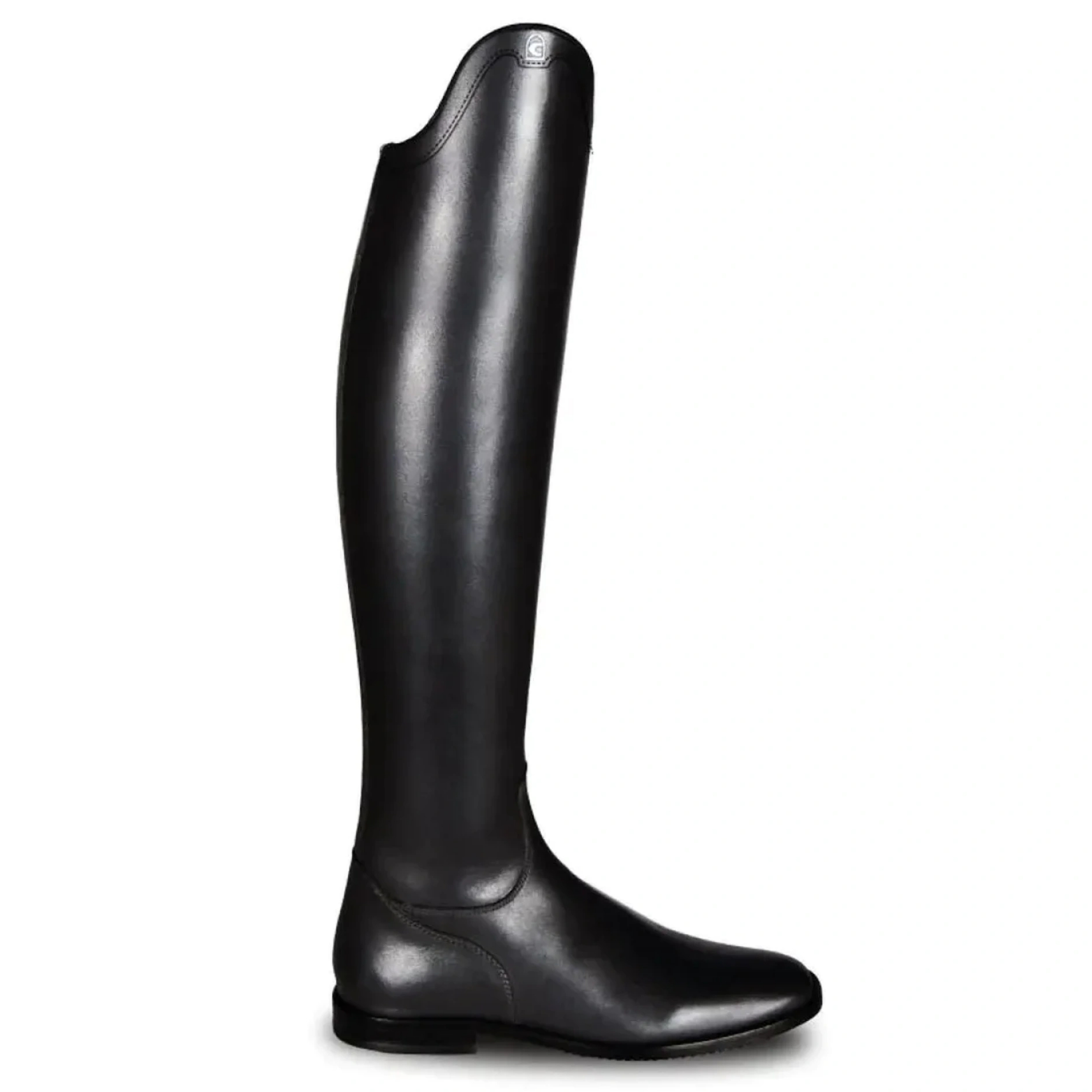 Meget elegant dressurstøvle med ekstra høj bue. med kant på toppen af buen Modellen er med indvendig lynlås helt til foden. Hård yderside og blød inderside som giver en utrolig god støtte Støvlen er udført i stærkt, holdbart kernelæder. Med brun sål Sort str 5 højde 48 vide 37