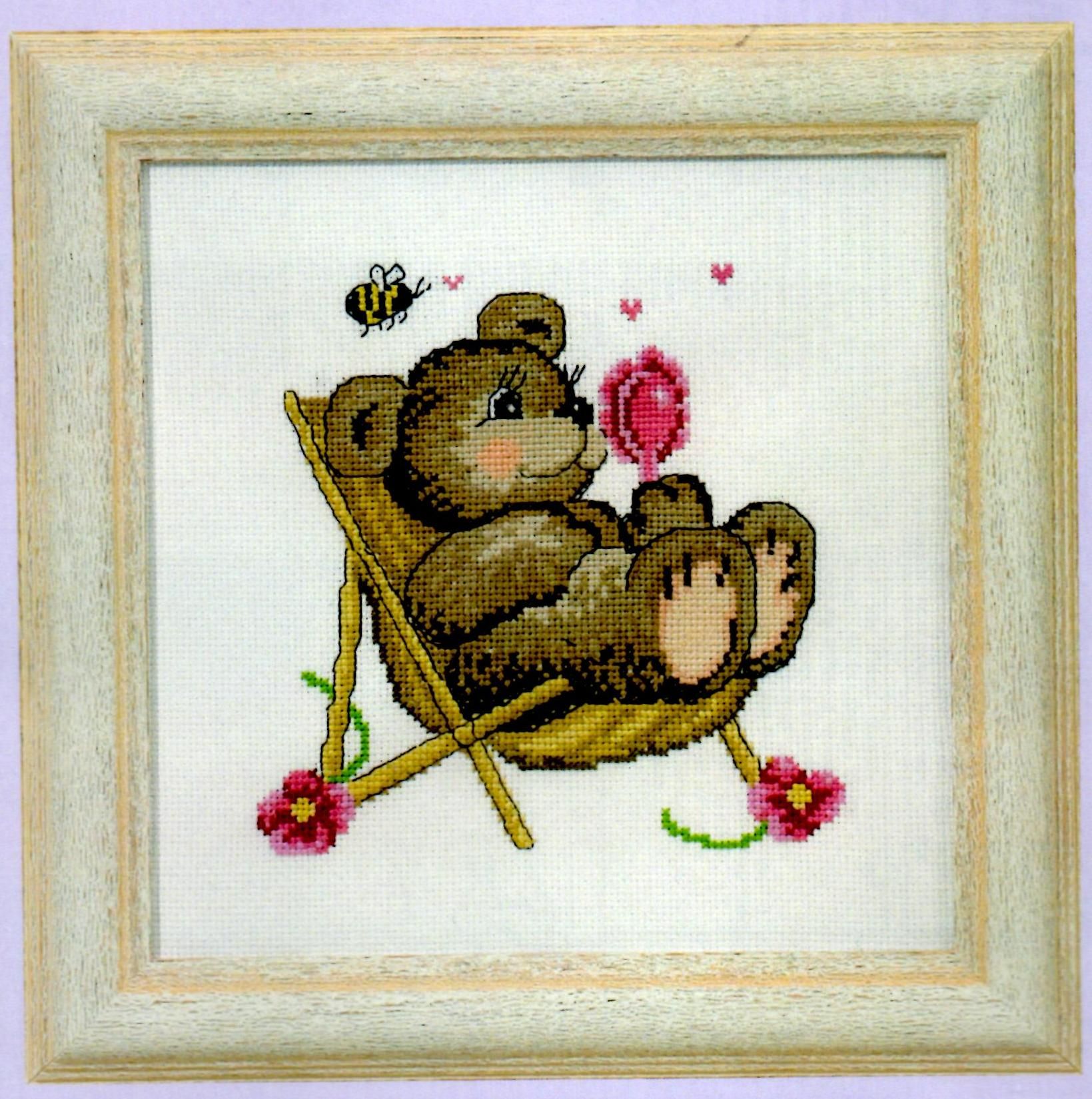 Billede m. bamse 19 x 19cm, stof aida 6,4tråde/cm hvid.