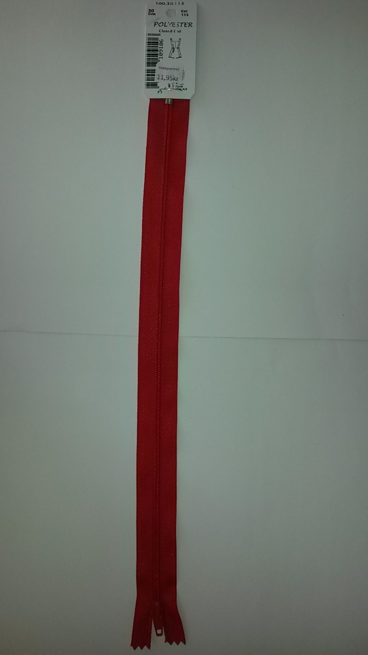Nylon, non séparable, Lynlås 30cm, rød. col. 113.