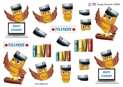 HM-Design, 3D Blå studenter ugler med tekst "Årets student" og "Tillykke".