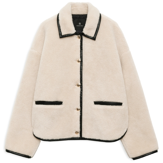 Camden Jakke fra ANINE BING er en tidløs overgangsjakke i blødt, teddy-inspireret materiale. Den har en klassisk skjortekrave, sorte kontrastkanter og knaplukning foran. De diskrete sidelommer og det elegante design gør den perfekt til et afslappet, men stilfuldt hverdagslook.