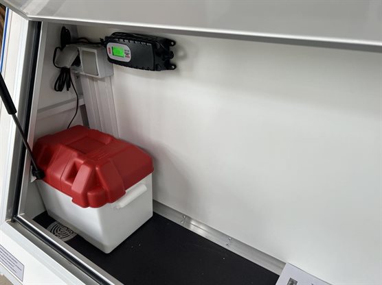 Eget batteri, så traileren ikke skal være tilkoblet bilens stik for udsugning. Op til 15 timers udsugning på én opladning. 12 V smart charger, sikrer at batteri ikke overlades. 13 A CEE indtag med adapter, der kan bruges i alle hjem. | Batteri m/lader f. el-ventilation hundetrailer | Kundeservice