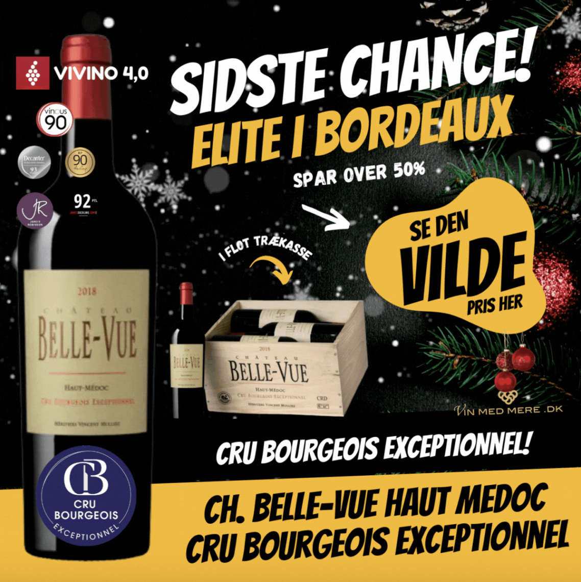 Eksklusiv Cru Bourgeois Exceptionnel fra Haut-Médoc! Château Belle-Vue Haut-Médoc 2018 tilhører den absolutte elite i Bordeaux – og har opnået den sjældne og prestigefyldte klassifikation “Cru Bourgeois Exceptionnel”, som kun meget få slotte er tildelt. Dette er et af Médocs mest respekterede vine, ofte rangeret på niveau med flere Cru Classé-slotte. ★★★★★ 90/100 af Robert Parker ★★★★★ 16+/20 af J. Robinson ★★★★★ 93/100 af Decanter ★★★★★ 88/100 af Wine Spectator ★★★★★ 92/100 af James Suckling ★★★★★ 90/100 af Vinous ★★★★★ 92/100 af Alexander Ma ★★★★★ 89/100 af Vinous Neal Martin Robert Parker: "From northern Macau, the 2018 Belle-Vue includes five grapes in the blend for the first time this vintage: 48% Cabernet Sauvignon, 30% Merlot, 20% Petit Verdot, 1% Cabernet Franc and 1% Carménère. Aging is projected to run 14 months in 30% new, 30% one-year-old and 20% two-year-old barrels, and the wine has 14% alcohol. Deep garnet-purple colored, it sings of chocolate-covered cherries, fresh red and black currants and black raspberry scents with hints of wild sage, pencil lead and lavender. Medium to full-bodied, the palate has bags of freshness and energy with a chewy texture and mineral-tinged finish." Cru Bourgeois Exceptionnel: Cru Bourgeois Exceptionnel er den højeste rang inden for Cru Bourgeois-klassifikationen for Bordeaux-vin, og det markerer de absolut bedste vinmarker i Médoc, der ikke er med i den klassiske 1855-klassifikation. Denne kategori blev indført for at anerkende og fremhæve de mest konsekvente og kvalitetsorienterede vinslotte, der producerer vin på et niveau, der ofte kan måle sig med de traditionelle Grand Cru Classé. Om producenten og vingården: Château Belle-Vue ligger i den sydlige del af Haut-Médoc, lige ved grænsen til Margaux. Slottet har gennem det seneste årti positioneret sig som et af de sikreste kvalitetsvalg i området, særligt takket være en markant andel Petit Verdot i blenden. Slottet drives i dag af Mulliez-familien, der også ejer de anerkendte slotte Château de Gironville og Château Bolaire. Belle-Vue er kendt for at være et moderne og kvalitetsdrevet slot med stor fokus på terroir og druesammensætning. Markerne drager fordel af de dybe, grovkornede grusjorde, som giver vinene stor mineralitet og karakter. Vinhuset prioriterer bæredygtighed (HVE-certificeret) og håndhøst, hvilket sikrer druer af ypperste kvalitet muligt. Vinificeringen omfatter kolde præ-gæringsmacerationer og lang fadlagring på egetræ (30% nye fade), hvilket understreger vinens struktur og lagringspotentiale. Området og klassifikation: Området Haut-Médoc er en prestigefyldt vinregion på venstre bred af Gironde-floden i Bordeaux, og det udgør den øvre, sydlige del af Médoc-halvøen. Det dækker cirka 5.000 hektar og inkluderer verdensberømte appellationer som Margaux, Saint-Julien, Pauillac og Saint-Estèphe, alle kendt for at producere nogle af Bordeauxs fineste rødvine. Miljøet i Haut-Médoc er særlig velegnet til Cabernet Sauvignon, som dominerer sammen med Merlot, Cabernet Franc, Petit Verdot og i mindre omfang Malbec. Kombinationen giver vinene kompleksitet, struktur, fast tanninindhold og et stort aldringspotentiale. Generelt karakteriseret ved fyldighed, velafbalanceret struktur og aromaer af solbær, cedertræ og krydderier, som udvikler sig med alderen til noter af læder, tobak og skovbund. Klassifikationsmæssigt er Haut-Médoc kendt for sine vine, der ofte har en lang lagringshorisont på 10-15 år, og området inkluderer mange Cru Bourgeois-klassificerede vine, hvor "Cru Bourgeois Exceptionnel" er den højeste og sjældneste kategori inden for denne klassifikation. Kun få slotte opnår denne status, herunder Château Belle-Vue, som markerer vinens kvalitet og prestige. Haut-Médoc repræsenterer det bedste af Médoc med sin kombination af jordbund, klima, vinproducenter og historisk arv, og vinene herfra regnes blandt verdens mest eftertragtede Bordeaux-rødvine. Druesammensætning og vinifikation: Château Belle-Vue Haut-Médoc 2018 har en druesammensætning, der typisk består af: Cabernet Sauvignon: ca. 48% Merlot: ca. 30% Petit Verdot: ca. 20% Cabernet Franc: ca. 1% Carménère: ca. 1% Vingården har nogle af de ældste Petit Verdot-stokke i Bordeaux, med nogle planter helt tilbage fra 1936. Druerne dyrkes med stor omhu på 15 hektar i Haut-Médoc. Vinen gennemgår en lang fermentering og modnes i ca. 14 måneder, hvoraf 40% foregår på nye franske egetræsfade. Denne sammensætning giver vinen dens dybde, struktur og kompleksitet, karakteristisk for højklasse Haut-Médoc vine. Denne sammensætning giver kompleksitet og rigdom, hvor Cabernet Sauvignon leverer krop...