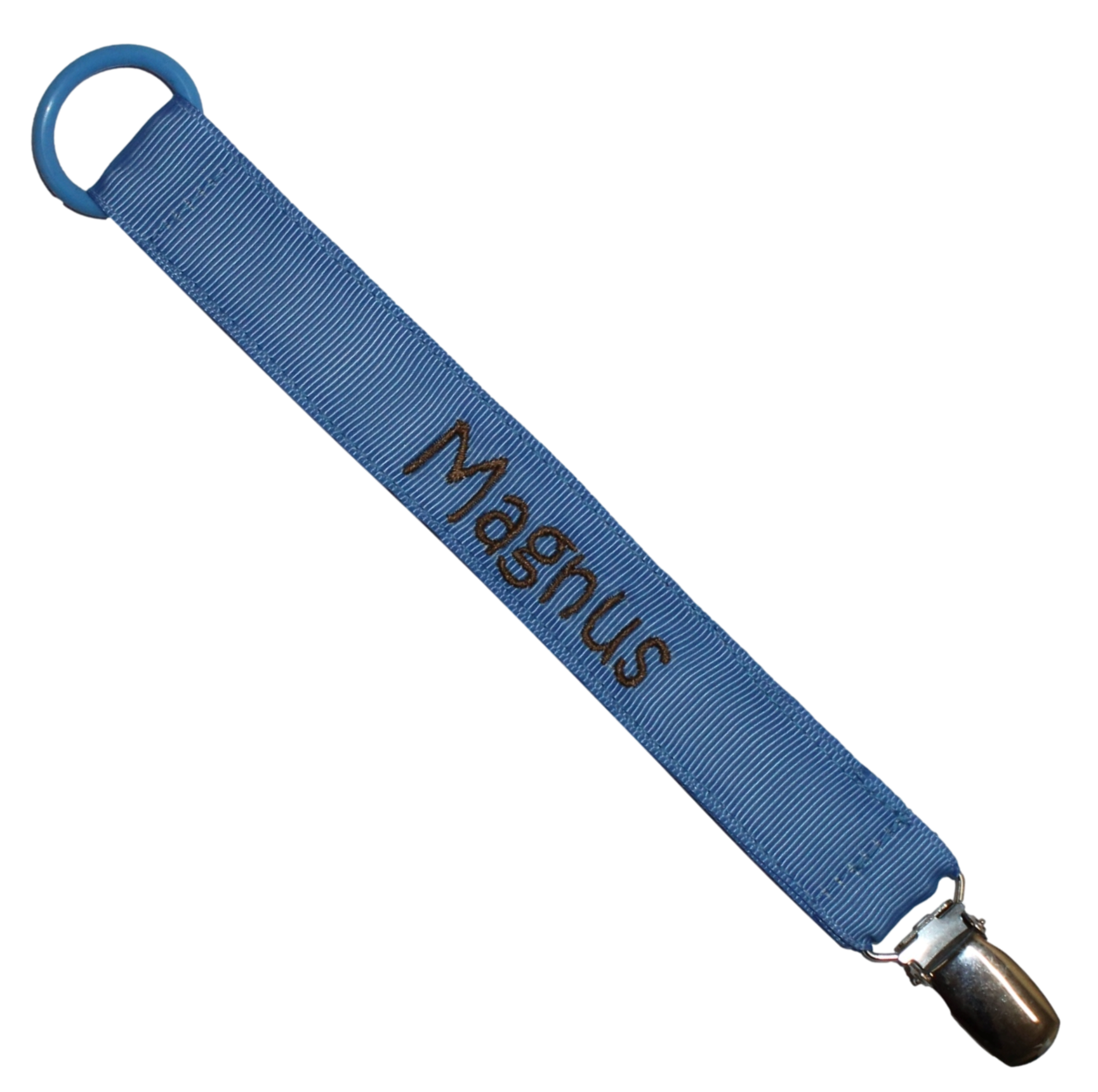Sutteholder med navnet Magnus - Demomodel Sutteholderen holder styr på sutten, så barnet ikke taber den. Syet i dobbelt grosgrain bånd Clipsen er nikkelfri Sutten sættes fast med en silikonering Længden er 22 cm og overholder den korrekte længde i henhold til Safety Standard EN-12586:2007 Sutteholderne er håndlavede i Danmark Kan bruges til sutter med ring og med knop (se billede) Ønsker du navn på, kan du vælge mellem flere trådfarver. (Vi broderer med skrifttypen som vi synes bliver pænest til navnet) Bemærk: brodereiet kan ses på bagsiden.