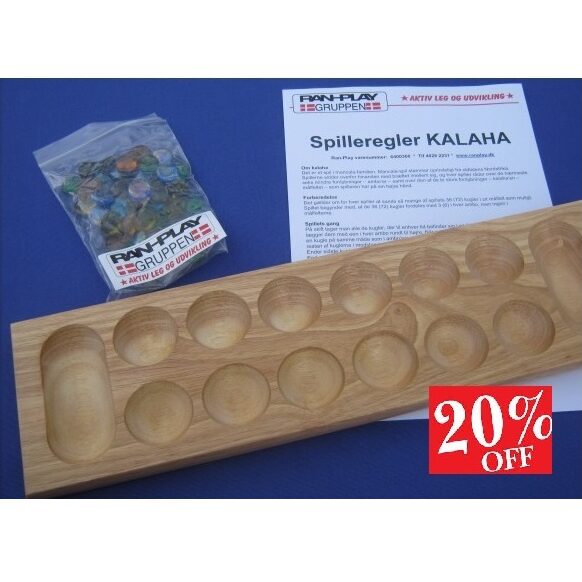 Et flot KALAHA brætspil mål 450x140x20 mm lakeret træ incl. glas brikker. Incl. spilleregler på dansk. Kalaha er et hyggeligt familiespil, som også rummer lidt taktik, så det er en god introduktion til dette for børn. Samtidig er spillet hurtigt at lære og nemt at spille og overskue for børnene. Kalaha er et brætspil for 2 spillere, som spilles på en spilleplade med i alt 14 spillefelter (fordybninger). Hver spiller råder over 6 mindre fordybninger (kaldet ambos) samt en større fordybning (målfeltet - kaldet kalahaen).Det gælder om, at få sine kugler placeret så taktisk godt, at man kan få flest mulig hjem i sit eget målområde.Vinder er den, der har flest kugler i mål til sidst. Spillereglerne er uhyre simple, så man er hurtigt i gang med det sjove: Nemlig at spille.Spillets oprindelseKalaha som vi kender det i dag er ikke frygtelig gammelt. Det kom frem tilbage i 1940'erne. Men det bygger på det oldgamle Mancala-spil, der har tusindvis af år på bagen. (ØNSKER DU AT PRINTE SIDEN? SÅ GÅ NEDERST PÅ SIDEN OG TRYK PÅ PRINTER) Dette produkt leveres fragtfrit! men ved ordre under kr 800,- kan der blive pålagt kr 80,- i ekspeditionsgebyr ved "kassen".Ran-Play varenr: 6400360CE 74 * 796159
