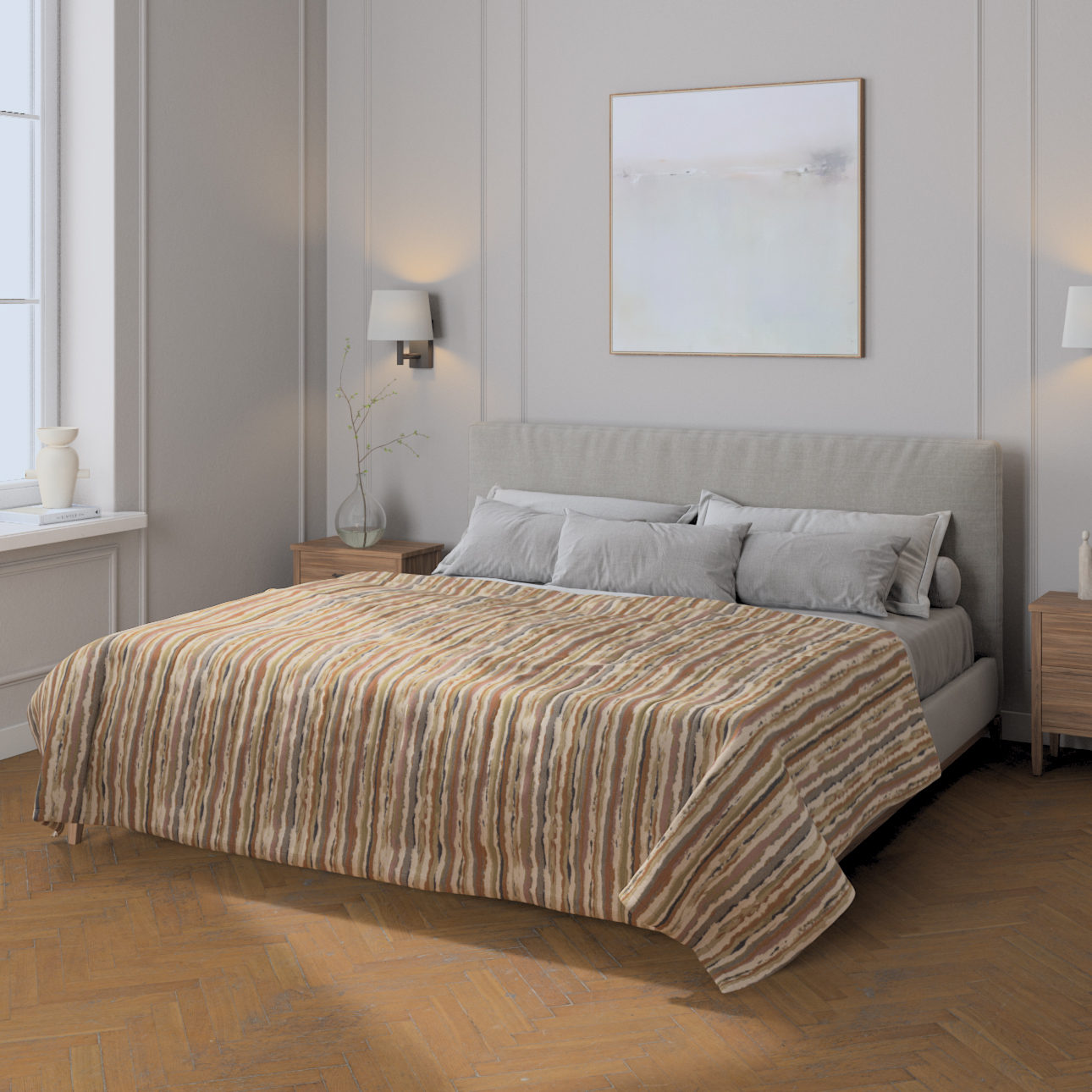 Dekorativt tæppe til seng eller sofa med fliesfyld, 120g/m2. Quiltet i striber med afstand på 10cm. Hvis sengetæppet skal syes af 2 stofbaner (se bredden af stoffet under valgt stof) kommer der en sammensyning som kun er lidt synlig.