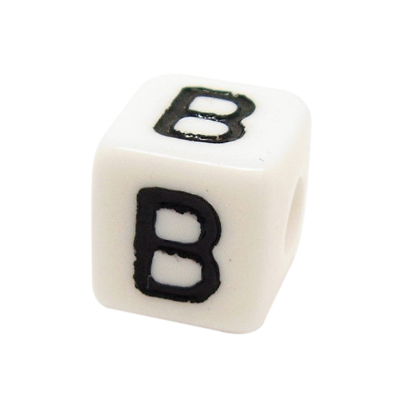 Bogstavperle i hvid acryl med præget bogstav på fire sider (der kan være lidt misfarvning på bogstavperlerne) Måler 10 x 10 mm Hulstørrelse 2-3 mm