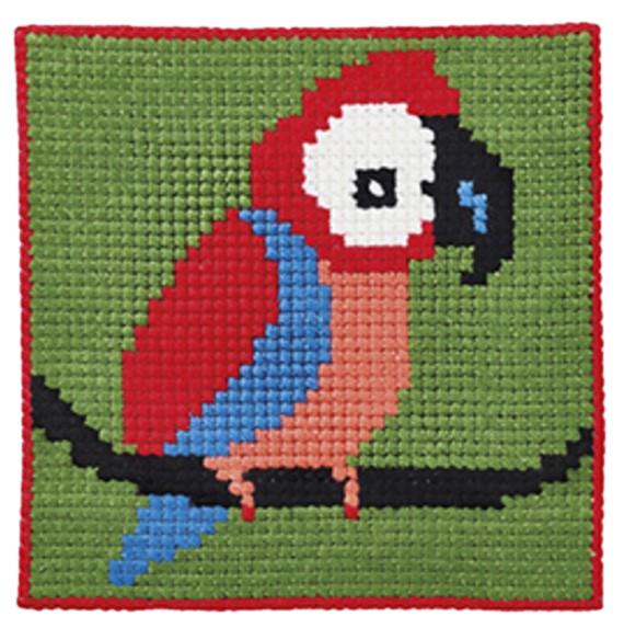 Billede med motiv af en papegøje Et smukt broderi som vil give mange hyggelige timer med broderinålen Pakningen indeholder: broderistof, på tegnet mønster, nål og garn Broderet med korssting over 2 tråde. Mønsteret er påtegnet. Materiale: Syet på Stramajstof 100% bomuld Garn: Acryl, sy med helt garn Størrelse: 25 x 25 cm