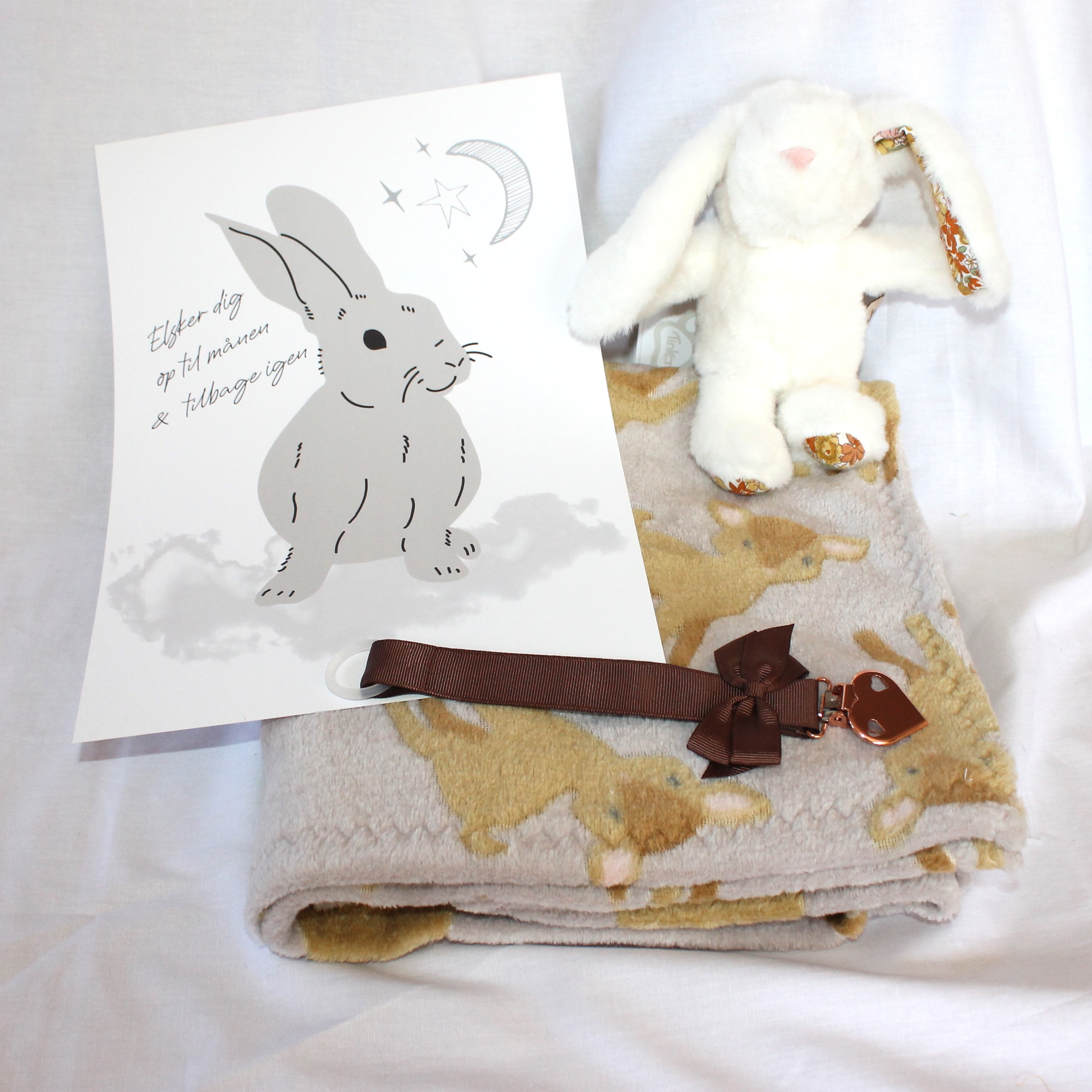 Lækker babypakke fra Bæklund Design - Unisex Pakken indeholder: 1 stk. sutteholder med barnets fornavn 1 stk. kanin med barnets fornavn (18 cm) 1 stk. fleece babytæppe 1 stk. plakat 1 stk. kode på 20% rabat på dit næste køb Værdien for denne skønne barselspakke er ca. 551 kr. Det eneste du skal betale er 249 kr. + fragten, men du kan også vælge at hente selv.