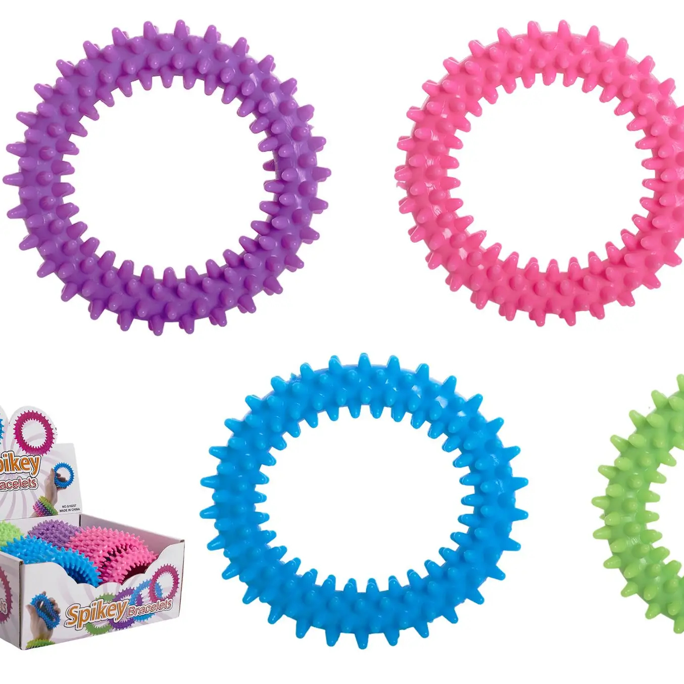 Sansearmbånd – blødt fidgetarmbånd med taktile pigge Dette sansestimulerende armbånd kombinerer leg, ro og bevægelse i ét. Armbåndet er lavet i fleksibelt TPR-materiale og har bløde pigge hele vejen rundt, som giver behagelig taktil stimulering ved berøring, klem og drej. Det kan bruges som fidget i hånden eller bæres om håndleddet – perfekt til urolige hænder og som en diskret sansestimulerende støtte i hverdagen. Armbåndet er let, behageligt og fleksibelt nok til at passe både børn og voksne. Fås i fire flotte farver: blå, grøn, pink og lilla. Fakta: Materiale: TPR (termoplastisk gummi) Udvendig diameter: ca. 8,5 cm Alder: Fra 3 år Assorterede farver
