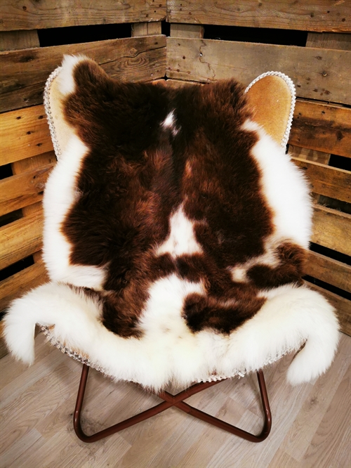 Skindet måler 125cm. Jacobs får er en meget sjælden fårerace som oprindeligt stammer fra Asien. Racen bliver omtalt i bibelen i forbindelse med apostlen Jacob (deraf navnet) og i 18hundrede tallet kom Jacob fåret til England. Jacob fåret er kendetegnet ved sort/grå/brun hvide farveaftegninger, både han og hun får kan have op til 6 horn og dets uld er højt værdsat. Skindene er store, klippede og meget fyldige. Skindet er både dekorativt men også meget velegnet som brugsskind, de sarte naturlige farvenuancer giver utallige anvendelsesmuligheder og som brugs og dekorationsskind på f.eks. spisebordsstole vil de være yderst velegnede.