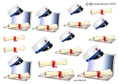 HM-Design, 3D Computer, eksamensbevis og studenterhue med blå bånd.
