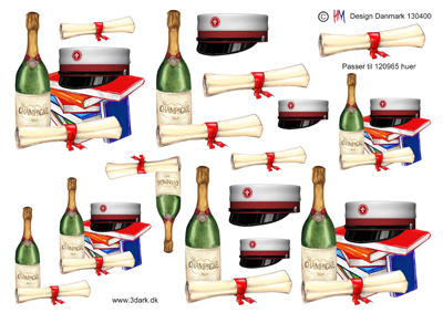 3D ark HM-design studenterhat med bånd og champagneflaske.