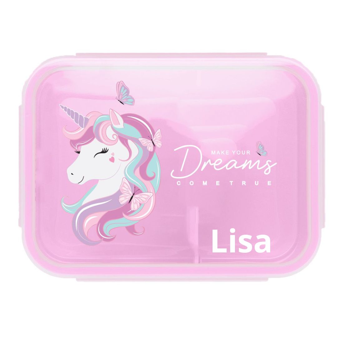 Sjov og smart madkasse med sød lille enhjørning. Stabil madkasse med børnevenlig lukning. OBS. Ønsker du navn på kan madkassen anbefaler vi at madkassen vaskes i hånden, da navnet ellers kan løsne sig. Godkendt til fødevarer. Måler ca.: 19 x 14 cm Materiale: Plastik OBS. Da vi sætter navn gratis på er der ingen garanti på holdbarheden. FIND MATCHENDE DRIKKEDUNK HER