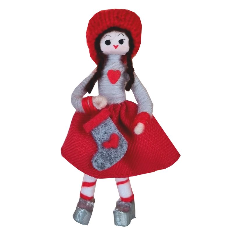 Årets nissepige med julesok 2025 fra Anne Beate Design Højde: ca. 11 cm Alle Anne Beate nisser er håndlavede og håndmalede. Alt er håndarbejde, lige fra de små håndstøbte zinktræsko til det fint syede tøj. Nisserne er lavet over et stålskelet og er derfor bøjelige og kan let formes til at stå som man ønsker. Anne Beate nisserne er lavet med stort omhu og koncentration, lige fra de fint beviklinger til de fine små detaljer. Nisserne bliver fremstillet både i Ringsted i Danmark og på et workshop i Hanoi i Vietnam.