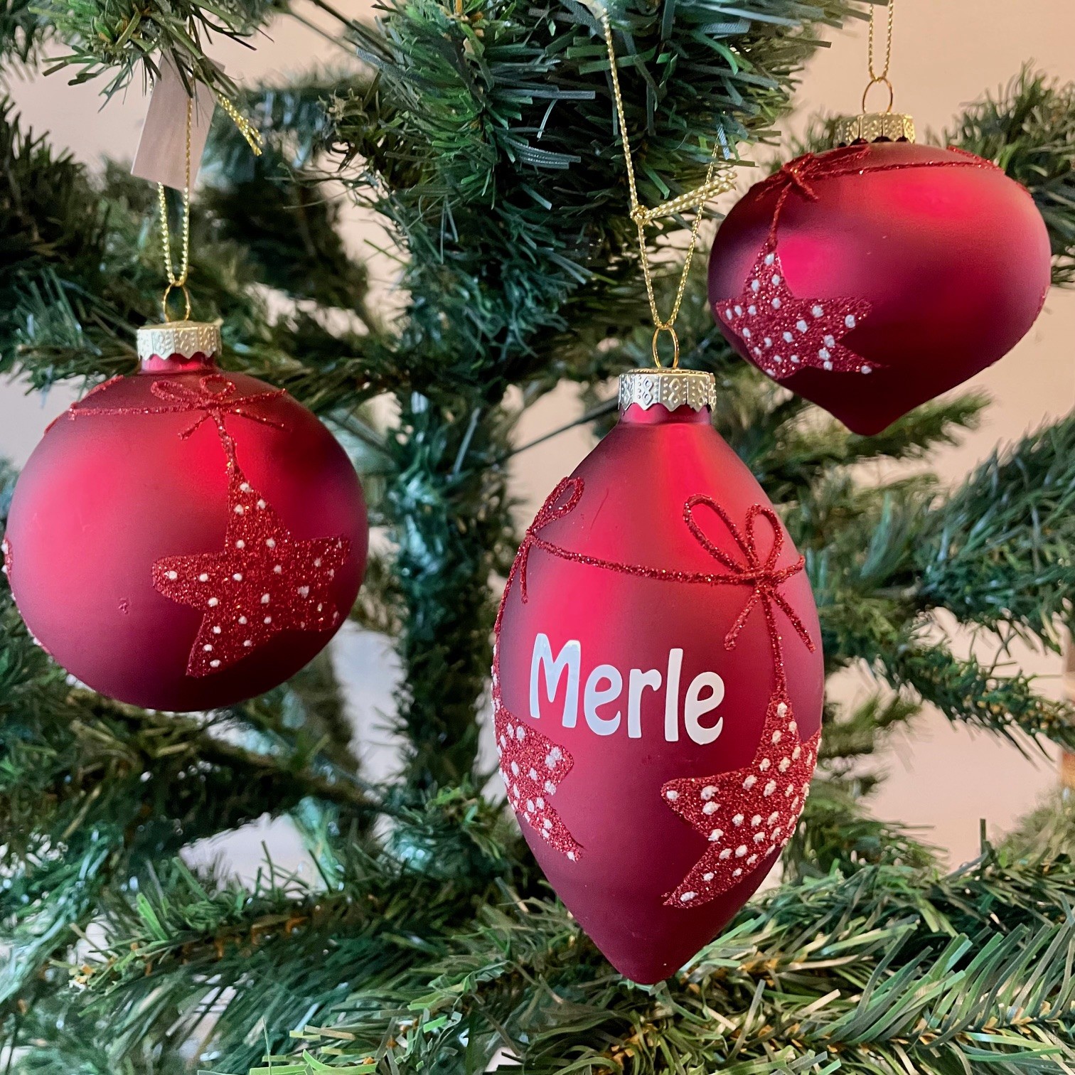 3 stk fine julekugler fra Pobra. På den ene julekugle er det muligt at få sat navn på med hvid skrift. Perfekt til at gøre juletræet endnu mere personligt Mål: ca. 12 til 7 cm i højden.