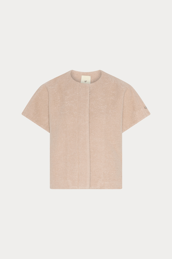 455HMBesea cape is a short, rounded cape with concealed buttons and a lightly textured wool look. The broad shoulders and clean lines create a calm, sculptural shape. Style it over a printed shirt or a light knit for layered ease, or use it as an outer layer with slim trousers for a balanced silhouette. - Short, boxy fit - Concealed button closure - Broad, lightly structured shoulders - Subtle back pleats