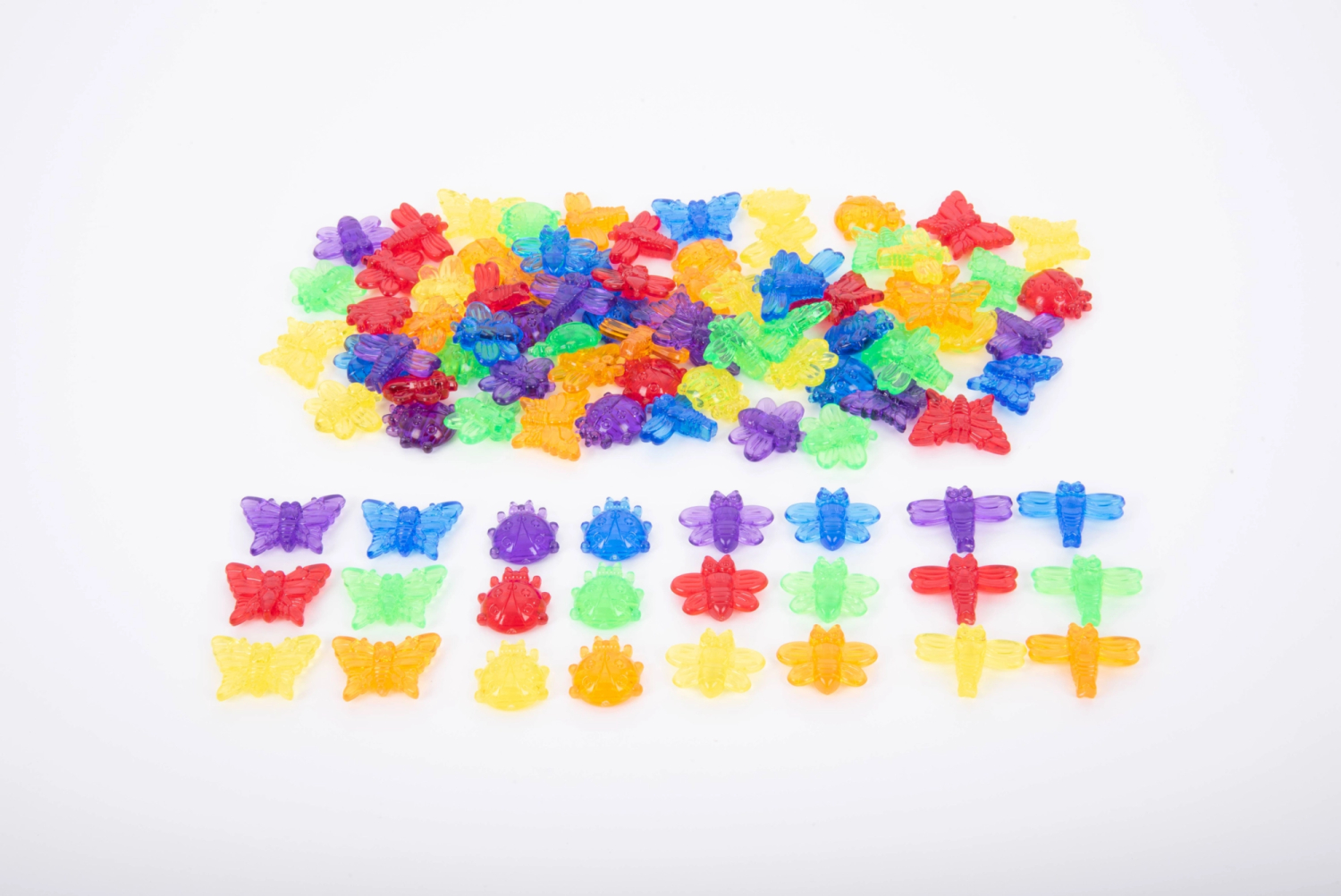 Transparente tælleinsekter – farverige insekter til leg og læring Transparente tælleinsekter er et sjovt og alsidigt læringsmateriale, der kombinerer talforståelse med sanseleg og farveglæde. Sættet består af små, detaljerede insekter i klare farver – sommerfugle, mariehøns, guldsmede og bier – som kan bruges til at tælle, sortere, skabe mønstre og lege med matematiske begreber. De gennemsigtige insekter kommer virkelig til deres ret på en lysplade, hvor børnene kan fordybe sig i farver, former og strukturer. Støtter udviklingen af: Talforståelse og tidlige regnefærdigheder Sortering og mønstergenkendelse Visuel perception og farvesans Finmotorik og fokuseret opmærksomhed Kategorisering og sproglig udvikling Brug dem til fx: At sortere efter farve, form eller type Tællelege og enkel plus/minus At skabe mønstre og rækkefølger Lyspladeaktiviteter og sensorisk leg Natur- og temabaseret undervisning Specifikationer: 4 forskellige insekttyper i 6 farver (rød, orange, gul, grøn, blå og lilla) Ca. 30–40 mm store Leveres i praktisk opbevaringsbøtte Fra 3 år (små dele – ikke egnet til børn under 3 år) Et oplagt valg til både institutioner og hjem, hvor leg og læring går hånd i hånd.