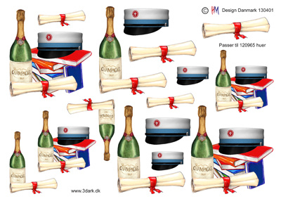 3D ark HM-design studenterhat med blå bånd og champagneflaske.