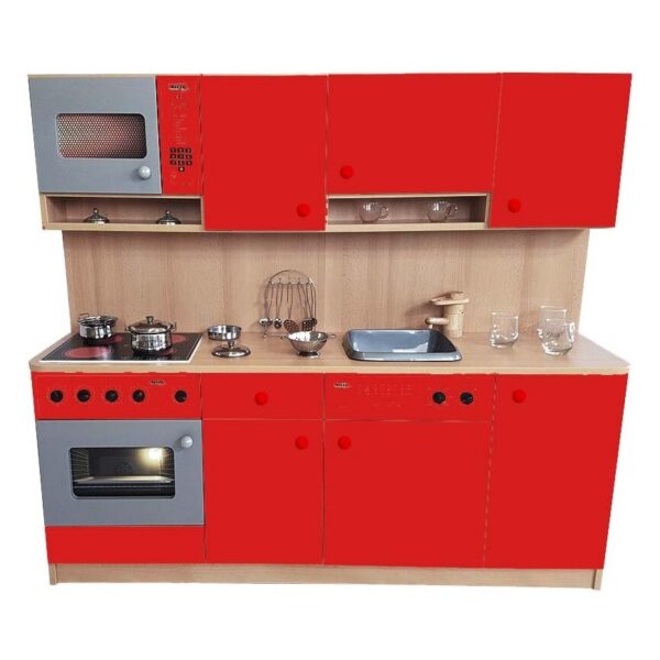 Børnekøkken i kraftig kvalitet. Forstærket udgave i træ, med greb og armatur i stål.Køkkenet er komplet med køkkenvask, mikro-ovn, komfur, emhætte, ovnindsats og opvaskemaskine.Emhætten kan trækkes ud, og mikroen er med drejeskive. Låger i rød og stållook.Størrelse:Længde: 140 cm.Højde: 125 cm.Dybde: 60/38 cm.Husk prisen er Inkl. fragt over hele Danmark - lige til døren.Ran-Play varenummer: 6101162Dette produkt leveres fragtfrit!CE 136*1600000