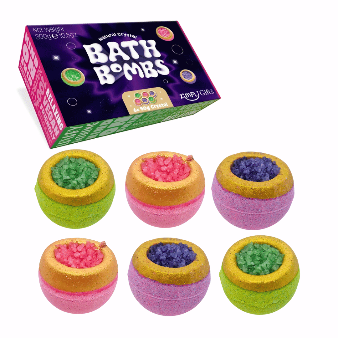 Zimpli Kids krystal badebomber – sanseforkælelse med duft og glimmer ✨ Forkæl sanserne med Zimpli Kids krystal badebomber – en luksuriøs kombination af boblende badebomber og glitrende badekrystaller!Når du lægger en krystalbombe i vandet, bruser den langsomt op og frigiver både farve, duft og små funklende krystaller, der gør badeoplevelsen helt magisk. De håndlavede badebomber er veganske, cruelty free og skånsomme mod huden, så de kan nydes af både børn og voksne. Perfekte til selvforkælelse, sanseleg i badet eller som en sansestimulerende aktivitet, hvor duften og farverne vækker ro og glæde. 💜 Fordele: 🫧 Indeholder både badebombe og badekrystaller i ét 💦 Fugtgivende og plejende for tør hud 🌿 Håndlavet, vegansk og uden farvning af hud eller badekar 🎁 Perfekt gaveidé til både børn og voksne 🫧 Sanseleg og ro i badetKrystalbadebomberne er oplagte til sanseleg og beroligende rutiner – især for børn, der finder ro i visuelle og taktile stimuli. Se, lyt og mærk, hvordan farverne spreder sig i vandet, og de små krystaller langsomt opløses. En enkel måde at kombinere leg, velvære og sanseintegration i hverdagen. Pakken indeholder 6 krystalbadebomber i forskellige farver og dufte – klar til at forvandle badet til et sanseunivers af boblende ro. Anbefalet alder: fra 3 år (bør anvendes under opsyn af voksen).Hudvenlig og sikker: Indeholder ingen skadelige stoffer, farver ikke hud eller badekar, og er let at skylle af. Ingredienser:Sodium bicarbonat, citronsyre, sodium sulfat, sorbitol, sodium klorid, sodium C14-16 olefin sulfonat, C10-18 triglycerid, mica, PEG-400, parfume: CI 19140, CI 45410, CI 16035, CI 45100, CI 60725. 🪷 Fakta om Zimpli Kids krystal badebomber 🧒 Alder: Fra 3 år 🫧 Indhold: 6 stk. badebomber med badekrystaller 🌿 Egenskaber: Vegansk, håndlavet og cruelty free 💧 Sikkerhed: Farver ikke hud eller badekar, let at rengøre 🇬🇧 Producent: Zimpli Kids, UK 🧪 Mere info om ingredienser Zimpli Kids’ krystalbadebomber er lavet af kosmetisk godkendte og hudvenlige ingredienser: Sodium bicarbonat (bagepulver) & citronsyre skaber den boblende effekt, når bomben rammer vandet. Sodium sulfat & sorbitol giver struktur og fugt til huden. Sodium klorid (salt) hjælper med at rense og blødgøre huden. Sodium C14-16 olefin sulfonat er en mild, plantebaseret sæbe, der giver skum. C10-18 triglycerid tilfører naturlig fugt og efterlader huden blød. Mica giver glimmer- og perleeffekt. PEG-400 sikrer jævn fordeling af farve og duft. Parfume og CI-farver giver duft og flotte farvenuancer i vandet. Alle ingredienser er kosmetisk godkendte, veganske og hudvenlige i de anvendte mængder.