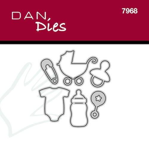 Baby fra Dan Dies indeholder 6 små dies med det sødeste baby tema. Der er en sut, barnevogn, sikkerhedsnål, rangle, sutteflaske og en bodystocking. Brug f.eks. de små motiver til fødselstavler, barnedåbs bordkort, layouts og meget, meget mere. Udskårne størrelser ca.: Barnevogn: 3x2,6 cm Bodystocking: 2,3x2,5 cm Sut: 1,5x2cm.
